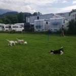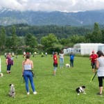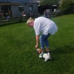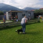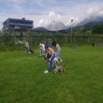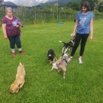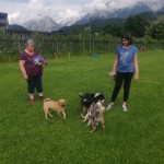 Heute übten wir das an der lockeren Leine gehen, wir trainierten das freudige Herrufen der Welpen und die Welpen lernten zur Ruhe zu kommen auf ihrer Decke. Natürlich durften die Kleinen auch miteinander spielen und sich im Hundepool danach abkühlen
