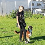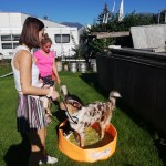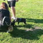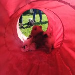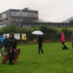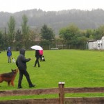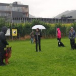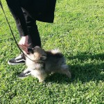 Im strömendem Regen übten wir ein wenig das Fußgehen, dann gingen wir raus und machten einen kleinen Spaziergang, wo wir die Leinenführigkeit trainierten und ganz wichtig: das Ruhigbleiben (Impulskontrolle), wenn Kinder an den Welpen vorbeilaufen vorbeilaufen
